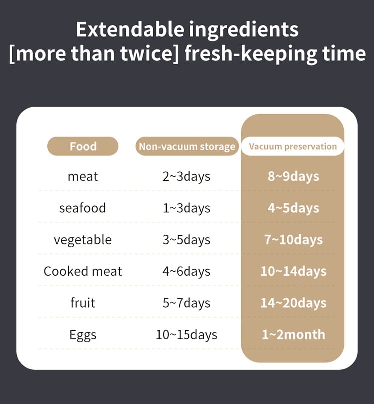 Tömmer luften på 10–20 sekunder och försluter på 2,5–5 sekunder för att hålla maten färsk upp till 5 gånger längre.