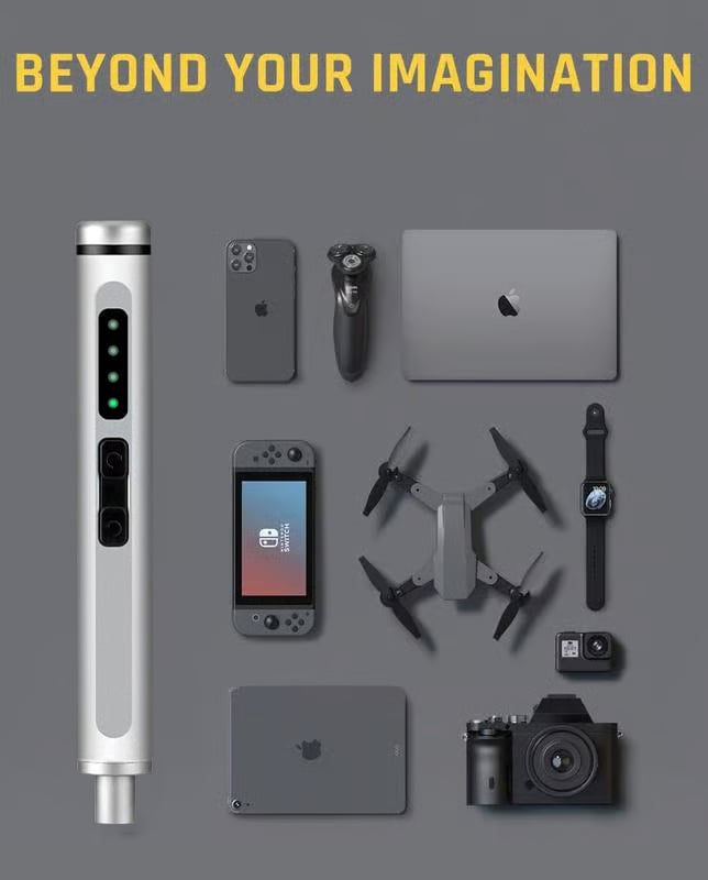 E1 MAX är en mini elektrisk precissionsskruvmejsel byggd för allt det där som kräver rätt känsla: mobilreparationer, surfplattor, klockor, kameror, smarta armband, småelektronik och annan finmekanik. Du får stabilt grepp i aluminium, smart magnetförvaring och en motor som gör jobbet snabbt – utan att tappa kontrollen.