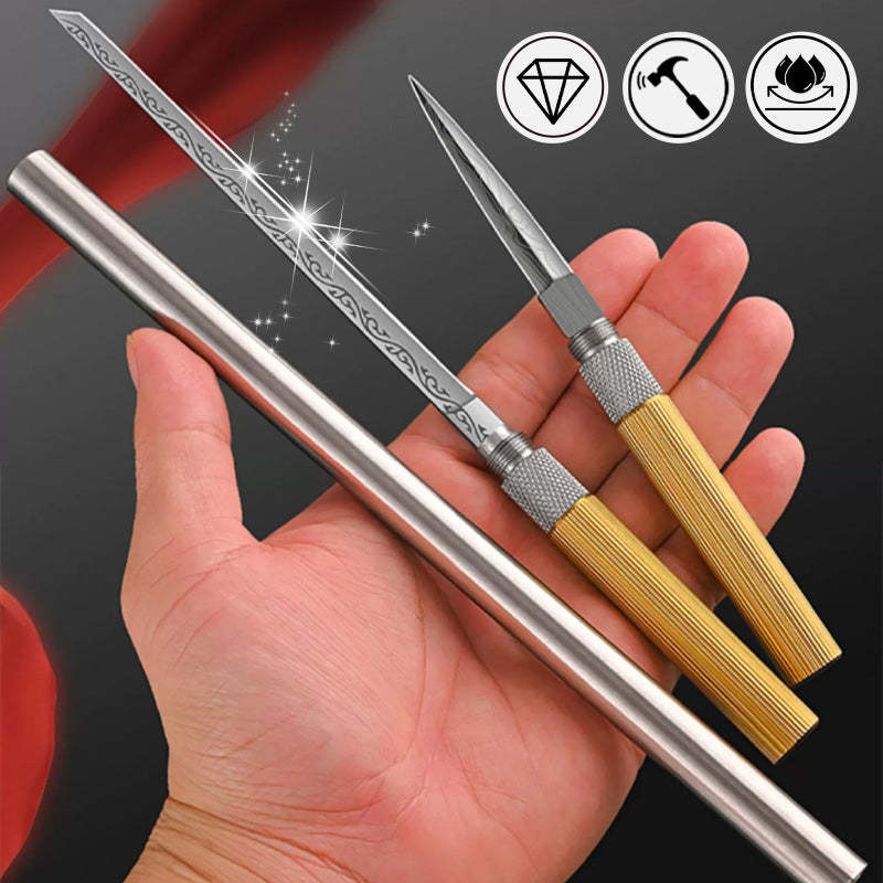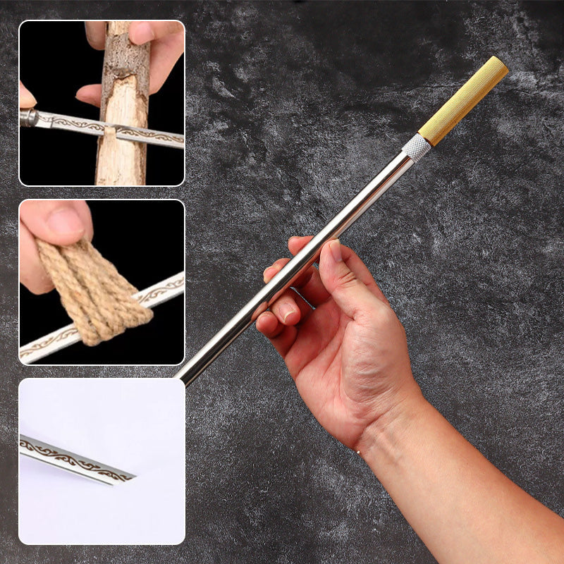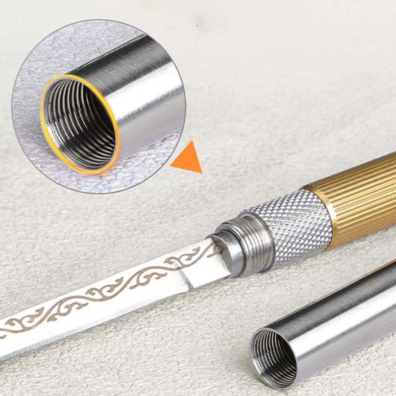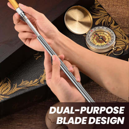 INNOVATIV KOMBINATIONSLAGRING - Kniven kommer med en smart design där både långa och korta blad kan kombineras med ett hållbart stålrör, vilket bildar en kompakt rund tub. Denna design säkerställer enkel förvaring och portabilitet utan att kompromissa med funktionaliteten.